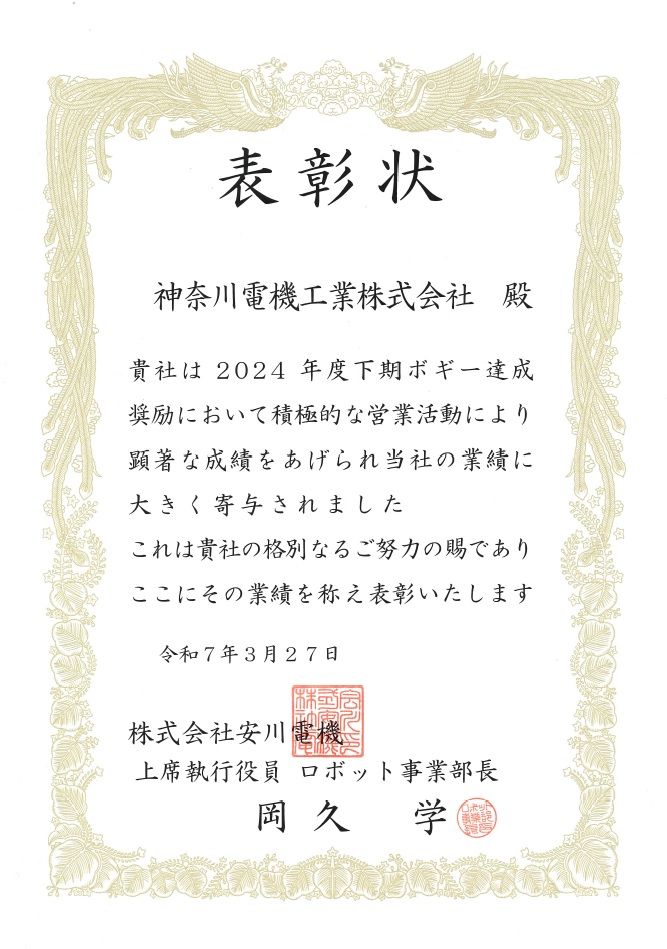 2025.03.31 未分類 株式会社安川電機様より2024年度下期ボギー達成奨励表彰状を受賞しました マイナビ転職 技術職のキャリア募集を開始しました 前の記事 株式会社安川電機様より表彰状を受賞しました 次の記事